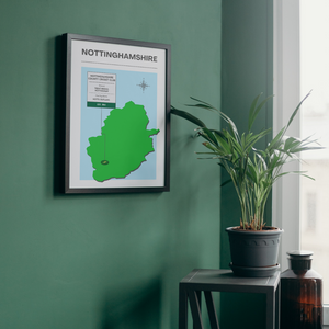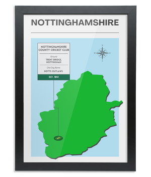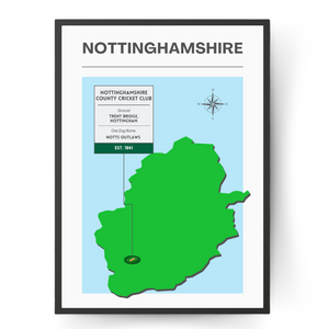 This print highlights Nottinghamshire County Cricket Club, featuring a map of the county, the county ground, and a fact box about the club. Our design is exclusive to Howzart, and comes in A4 to A2, with or without a frame.