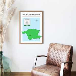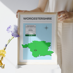 This print highlights Worcestershire County Cricket Club, featuring a map of the county, the county ground, and a fact box about the club. Our design is exclusive to Howzart, and comes in A4 to A2, with or without a frame.