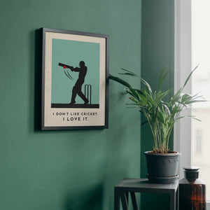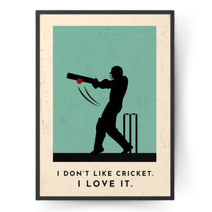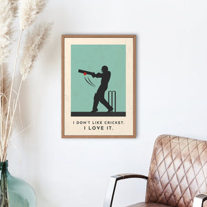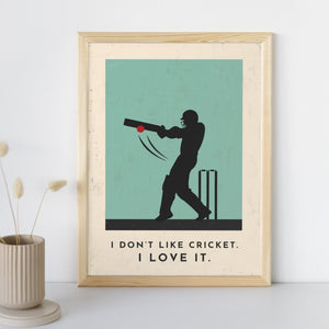 Celebrate your love of cricket with our stylish cricket art print, featuring a silhouette of a batsman striking the ball and the caption "I Don't Like Cricket. I Love It".