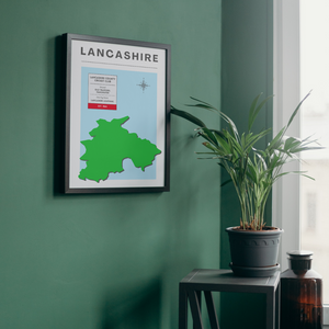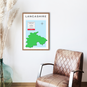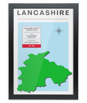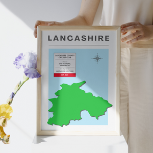 This print highlights Lancashire County Cricket Club, featuring a map of the county, the county ground, and a fact box about the club. Our design is exclusive to Howzart, and comes in A4 to A2, with or without a frame.