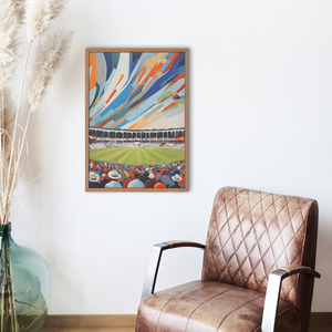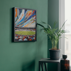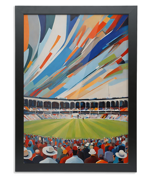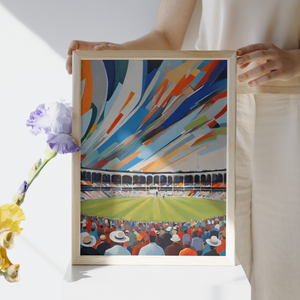 A colourful view from the stands of a cricket stadium, this unique art print will look great on any cricket fans wall.