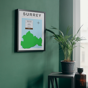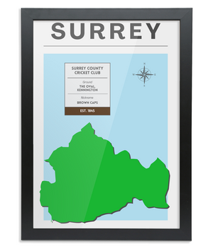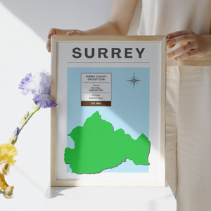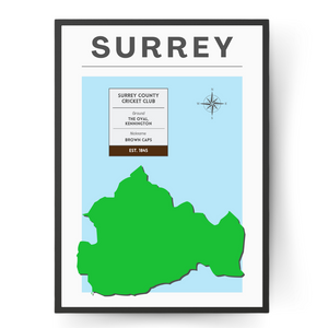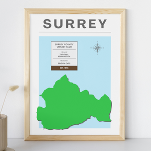 This print highlights Surrey County Cricket Club, featuring a map of the county, the county ground, and a fact box about the club. Our design is exclusive to Howzart, and comes in A4 to A2, with or without a frame.
