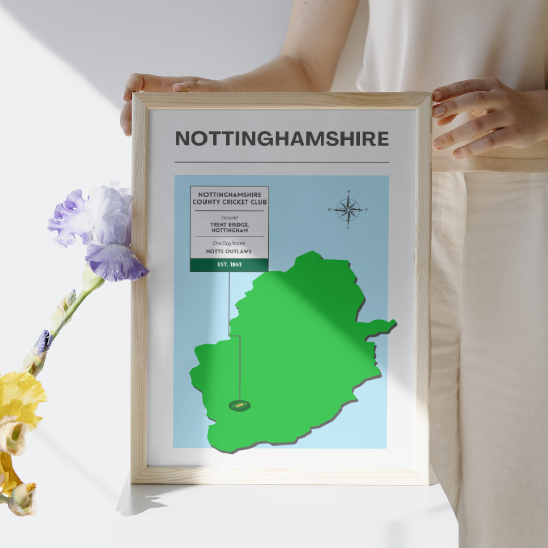 This print highlights Nottinghamshire County Cricket Club, featuring a map of the county, the county ground, and a fact box about the club. Our design is exclusive to Howzart, and comes in A4 to A2, with or without a frame.