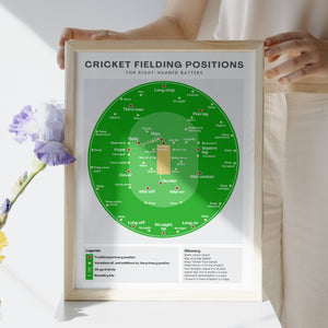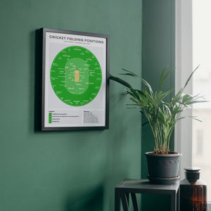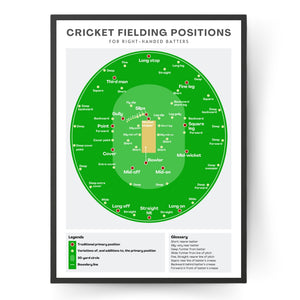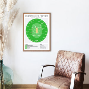 A comprehensive guide to cricket fielding positions, mapped out. Choose framed or unframed, and size A4 to A2.