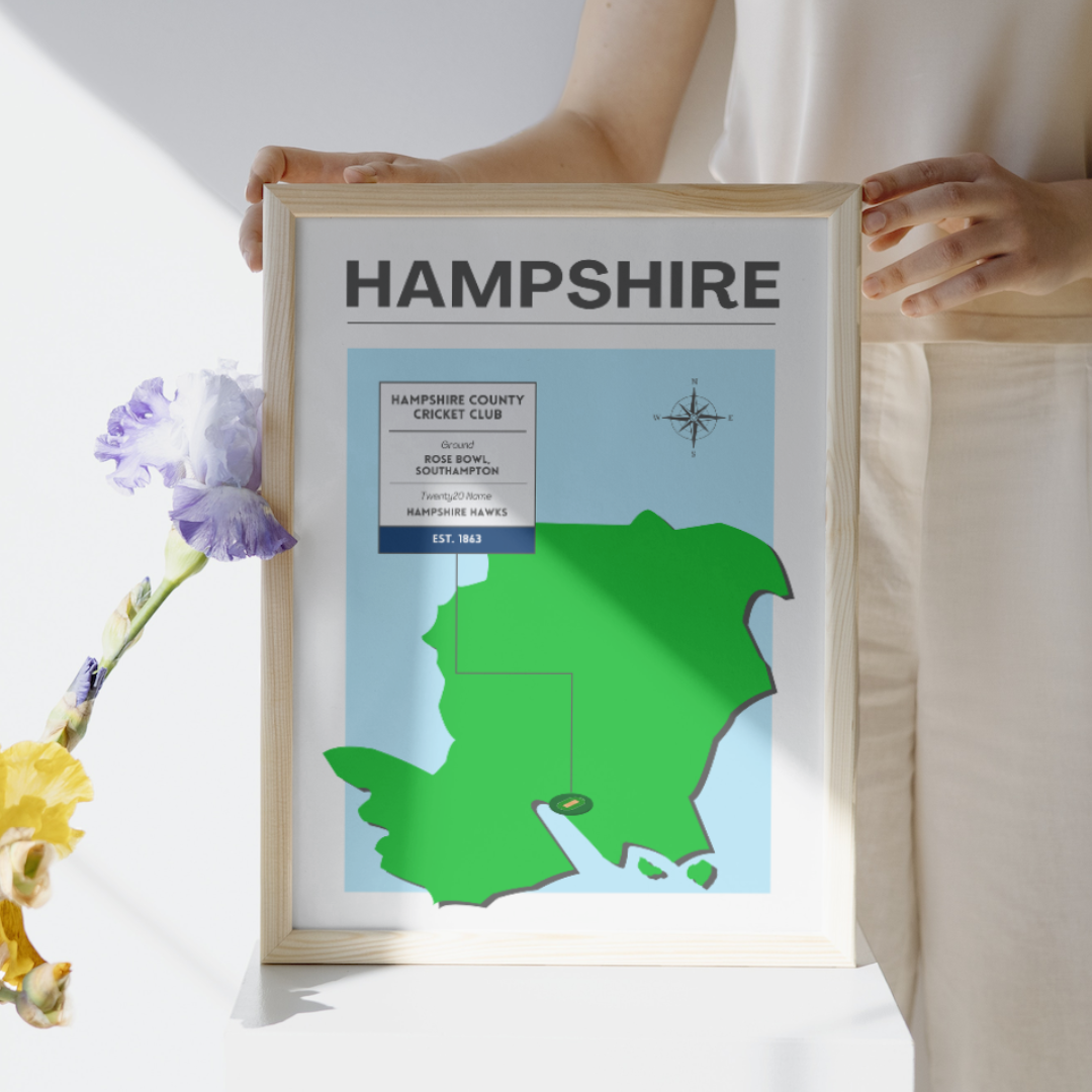 This print highlights Hampshire County Cricket Club, featuring a map of the county, the county ground, and a fact box about the club. Our design is exclusive to Howzart, and comes in A4 to A2, with or without a frame.
