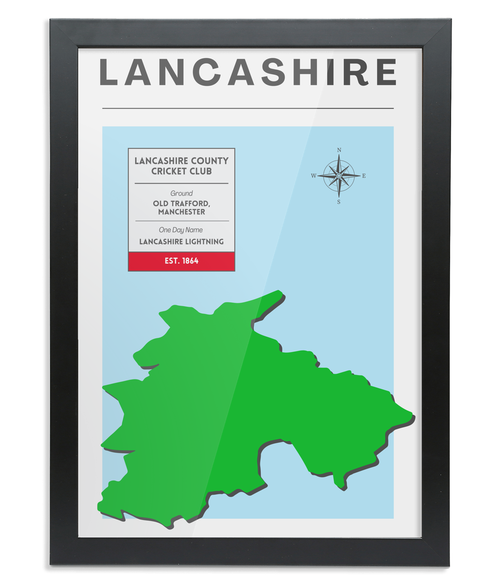 This print highlights Lancashire County Cricket Club, featuring a map of the county, the county ground, and a fact box about the club. Our design is exclusive to Howzart, and comes in A4 to A2, with or without a frame.